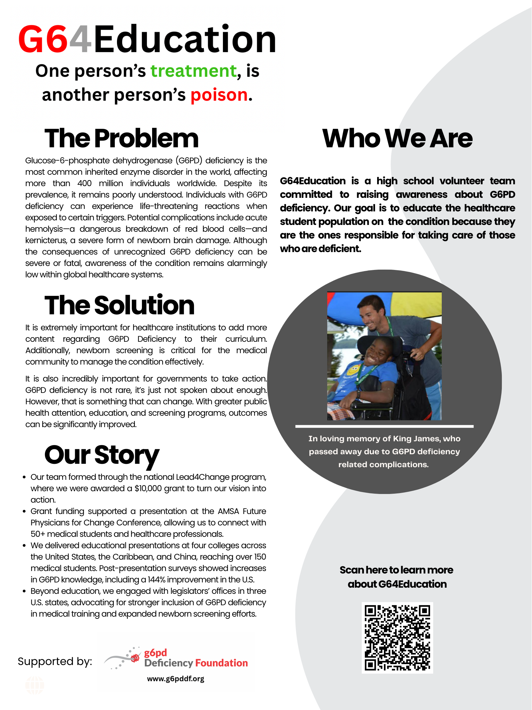 The g6pd Deficiency Foundation, Inc.’s purpose is to provide a website that has effective and enriching G6PD Deficiency information based on valid research and reported cases. Through the implementation of educational seminars & literature for the general public and medical community, we hope to encourage G6PD deficient individuals to live a healthy life. Meet the Board: https://g6pddf.org/meet-the-g6pd-board-and-advisors
